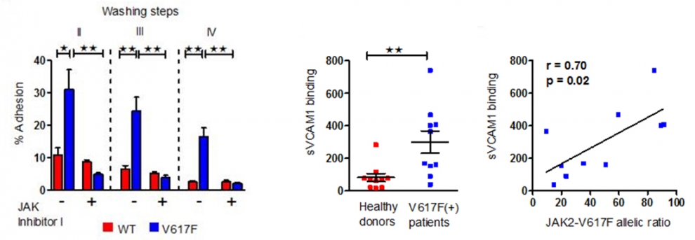 This includes investigation of adhesion of JAK2-V617F positive leukocytes in vitro and in vivo (JAK2-V617F knock-in mouse model). During the previous funding period, we found that JAK2-V617F aberrantly activates β1 and β2 integrins (VLA-4 and LFA-1) on leukocytes in CMN and identified the molecular mechanisms involved. Using the Vav1-Cre x JAK2+/V617F knock-in mouse model established in our laboratory, we aim to dissect the contribution of aberrant integrin activation for the JAK2-V617F- induced cytokine dysregulation, splenomegaly and pro-thrombotic state.